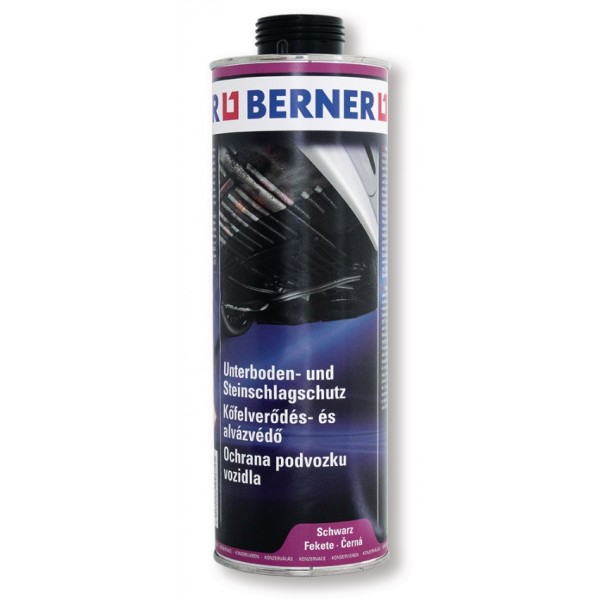 Berner alvázvédő ütésálló, fekete, 1 literes szórópisztolyra csavarható flakonban. A Berner UBS 2000 kőfelverődés védő és alvázvédő gépkocsi-fenéklemezek, sárvédők, kerékdobok, mellső és hátsó köténylemez stb. tartós réteggel való ellátására.