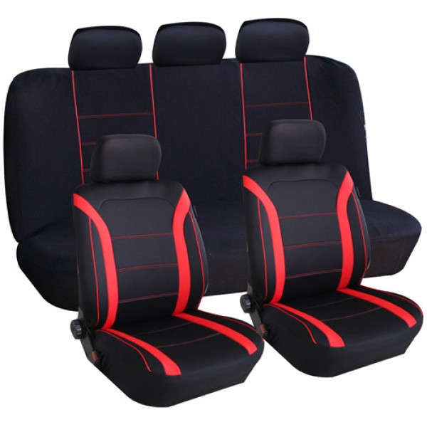 9 darabos üléshuzat garnitúra fekete-piros színben. A hátsó ülések huzata két részből áll, egy háttámla huzat és az ülőlap huzat.