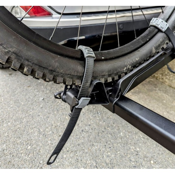 A racsnis hevederek lehetővé teszik a kerekek gyors és biztonságos rögzítését, a hosszú hevederek akár 4” széles gumiabroncsokat is befogadhatnak.