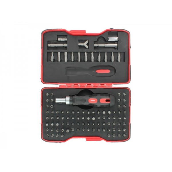 Racsnis csavarhúzó készlet, 101 részes bit készlet. A csavarhúzó 150 mm hosszú, racsnis, irányváltós és rögzíthető. A markolata gumírozott, hegye mágneses, ennek köszönhetően nem esnek ki belőle a csavarhúzó hegyek. A 101 részes csavarhúzó készletet egy praktikus tárolodobozban, a kényelmes tárolás érdekében.