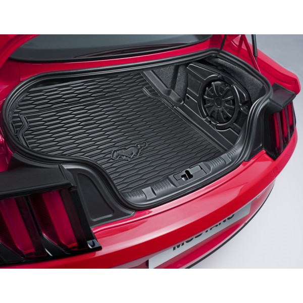 Ford Mustang gyári csomagtér tálca, Mustang logóval, 3,5cm magas hátsó és oldalsó peremmel.